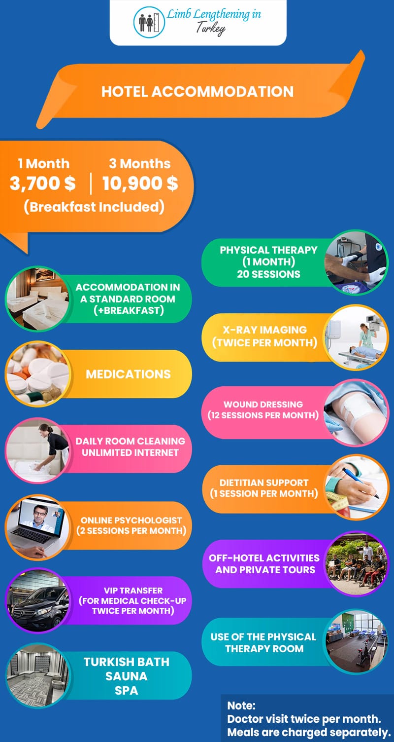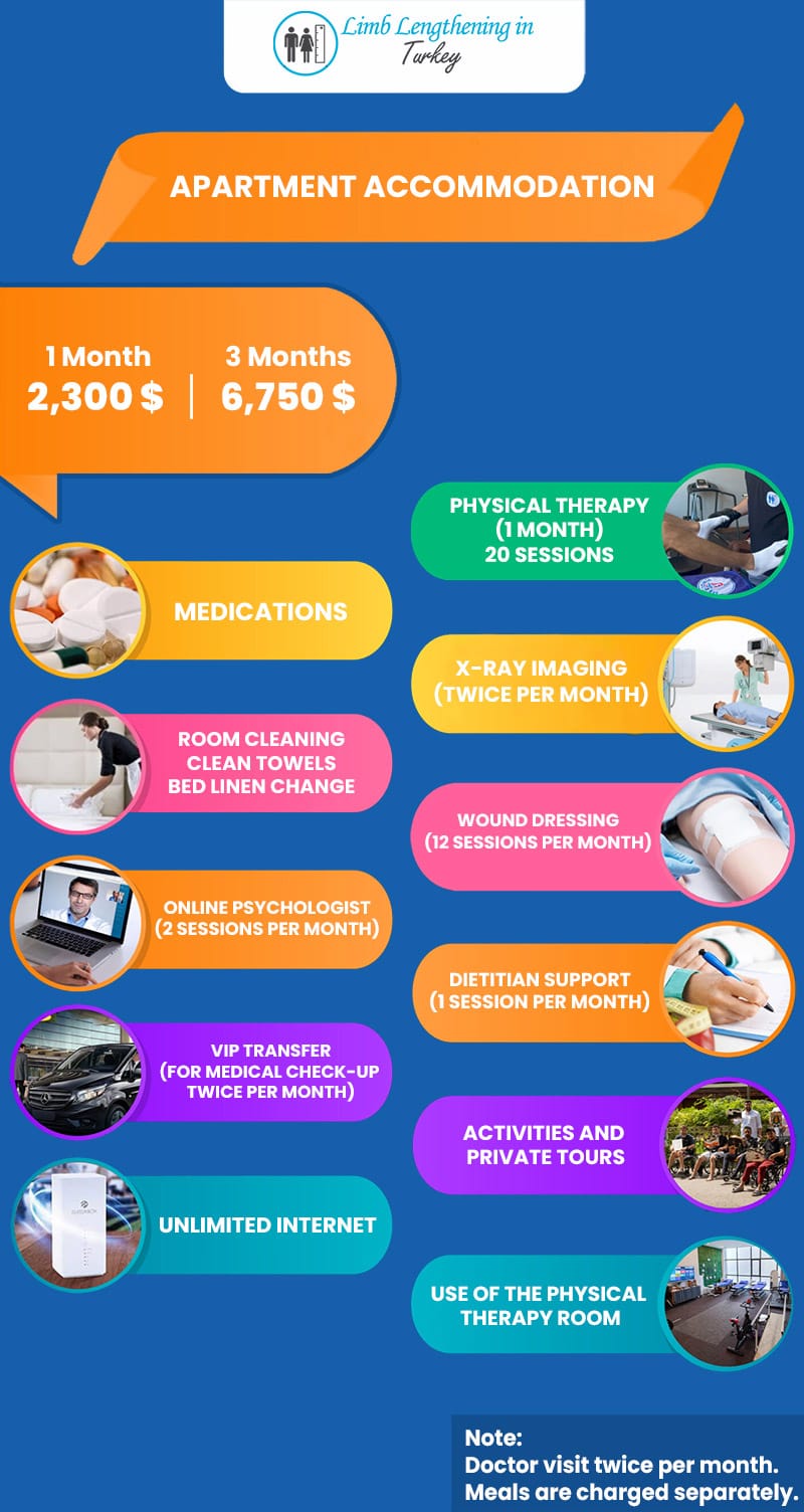 We provide patient accommodation, post-operative care, and physiotherapy services. There are two options regarding accommodation: hotel and apartment.